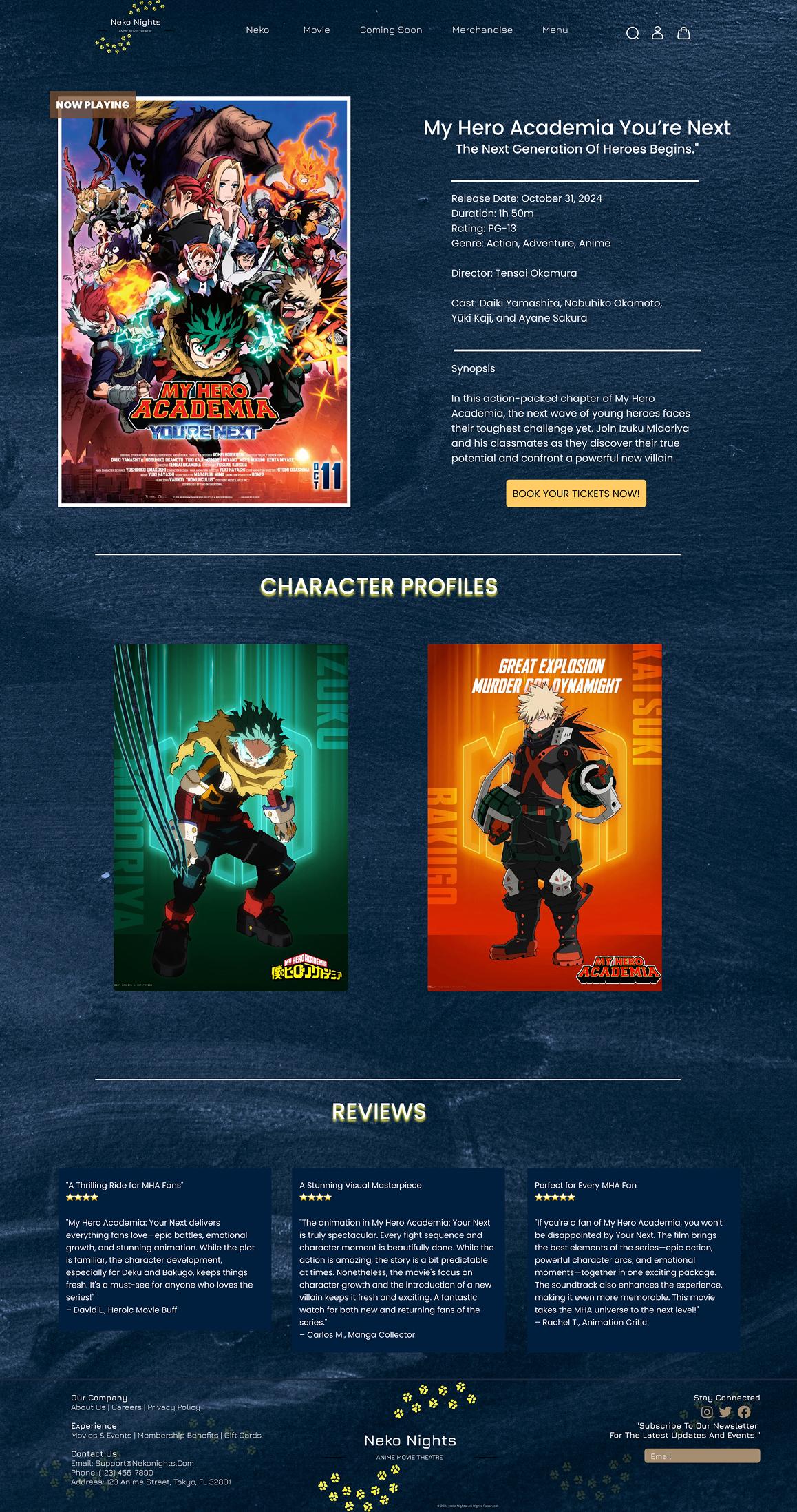 The website design emphasizes ease of navigation, showcasing upcoming movie showings, special events, and ticket purchasing options. By combining intuitive UX design with captivating UI elements, Neko Nights aims to provide an unforgettable cinematic journey for anime lovers.